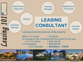 The Leasing Consultant will market and lease apartments in accordance with.